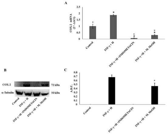 Cyclooxygenase-2 (COX-2) mRNA expression (A) and protein production (B, and C). COX-2 mRNA expression was determined by RT-PCR (A), and COX-2 protein production was determined using Western blot (B: representative immunoblot; C: protein expression calculated as Arbitrary Densitometric Units; A.D.U.) in the NCTC 2544 72 h after the addition of M. MeOH (50 µg/mL) with INF-γ + H. * Significantly different than control; ° significantly different than INF-γ/H-treated samples (p < 0.05).