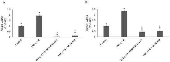 The expression of the inducible nitric oxide synthase (iNOS) is one of the direct consequences of an inflammatory process. Several methods such as RT-PCR, immunocytochemistry, and Western blot, have been used to describe the iNOS expression in many chronic human inflammatory diseases. The iNOS mRNA level is mainly regulated at the transcriptional level but also by other post-transcriptional regulatory mechanisms. Phenolic acid and flavonoids have been reported to inhibit iNOS expression in several cell types, including endothelial cells, epithelial cells, and macrophages, yet in some cell types like chondrocytes [26]. Here, our data showed that the iNOS mRNA level was increased after cell stimulation with IFN-γ/H for 72 h, with respect to the non-treated control. A significant inhibition of iNOS mRNA expression was observed when the NCTC 2544 cells were co-treated with IFN-γ/H and 50 μg/mL of M. MeOH extract. Compared to M. MeOH extract, indomethacin weakly reduced iNOS mRNA levels (Figure 4B).