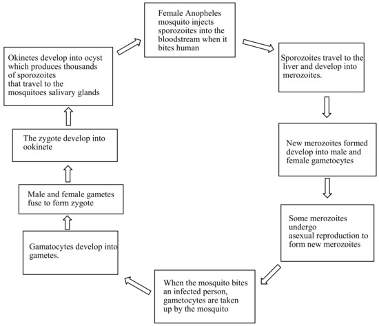 The infection begins with a bite from an infected mosquito, injecting Plasmodium parasite into the bloodstream, in the form of sporozoites [8]. The sporozoites are carried to the liver cells and multiply asexually to form a thousand merozoites over 7–10 days. This occurs without the appearance of the symptoms [9]. The merozoites are carried to the bloodstream, and invade the red blood cells and multiply again until the cells burst. This cycle is repeated, which results in symptoms such as fever, chills and headaches occuring. Some of the merozoites undergo asexual reproduction to form new merozoites [9]. The new merozoites develop into male and female gametocytes, which then spread into the bloodstream [10]. When the female Anopheles mosquito bites an infected person, the gametocytes will be taken up by the mosquito. In the stomach wall of the mosquitoes, the gametocytes form a zygote. After fertilization, the zygotes develop to form ookinete. Ookinete is transformed to oocyst which multiplies on the exterior surface of the mosquito stomach to form sporozoites. Inside the oocyst, sporozoites multiply and burst, thereby releasing thousands of sporozoites that travel to the mosquito’s salivary glands. The cycle of human infection begins once an infected mosquito bites another person [11,12] (Figure 1).