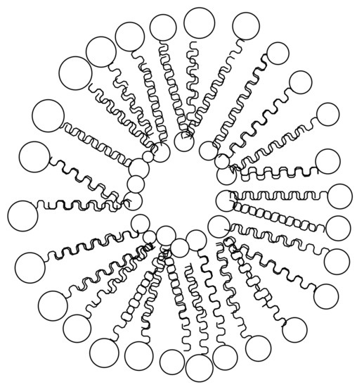 Polymeric micelles are nanocarriers formed from self-assembling of amphiphilic block copolymers with sizes between 10–200 nm [40] (Figure 4). They are characterized by a hydrophobic core and hydrophilic polymer chains used for the encapsulation of bioactive agents [41]. Hydrophilic chains enhance prolonged circulation time in the blood and provide a sustained drug release mechanism [42]. Micelles with low critical micelle concentration (CMC) are useful for pharmaceutical applications because it contributes to their stability toward dilution in biological fluids. However, micelles with high CMC dissociates, resulting in a dilution effect in the blood [42,43,44]. CMC is influenced by the type of polymer used to prepare the micelles. The only disadvantage with polymeric micelles is that they are difficult to prepare, because their preparation requires a high level of polymer chemistry [45]. The most commonly used hydrophilic chain used in the preparation of micelles is poly (ethylene glycol) (PEG). Others include poly (N-vinyl pyrrolidone) (PVP), poly (N-isopropyl acrylamide) (pNIPAM) and poly (lactic acid) (PLA) [46].