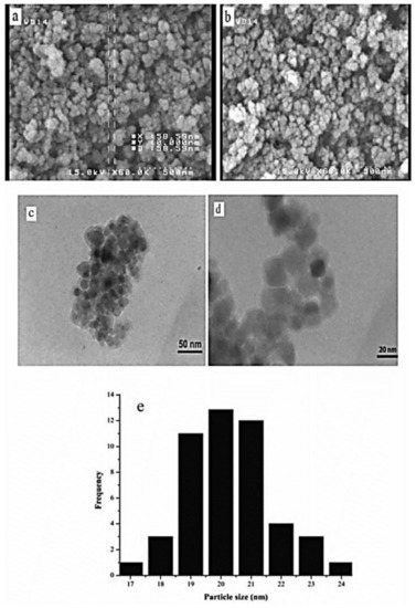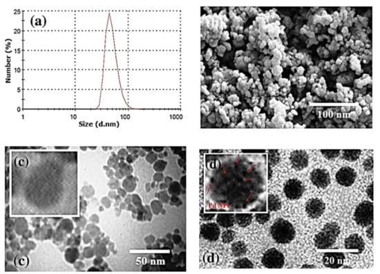 (a) DLS plot of Fe3O4@PCA/Pd(0)-b-PEG in water. (b) SEM image of Fe3O4@PCA-b-PEG. TEM images of (c) Fe3O4@PCA-b-PEG and (d) Fe3O4@PCA/Pd(0)-b-PEG at different magnifications. Reproduced with permission from [29].