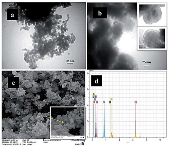 TEM images of (a,b) HMMS and (c) HMMS-salpr-Pd and (d) HMMS-salpr-Pd after six reuses [67].