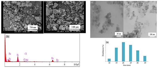 HRTEM images of Fe3O4/P(GMA-AA-MMA)-Schiff base-Pd before (a) and after (b) Suzuki‒Miyaura reaction. Reproduced with permission from [28].