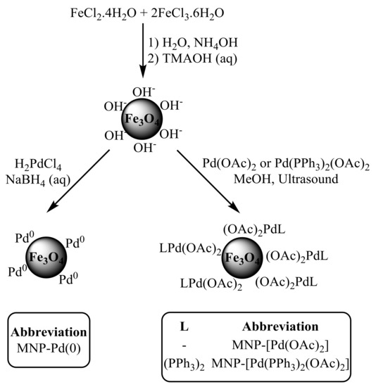 One of the simplest methods for the preparation of magnetically separable palladium catalysts is the direct immobilization of Pd NPs on the surfaces of magnetic materials; in this regard, Pd NPs are stabilized on un-functionalized Fe3O4 NPs. Indeed, this method has focused on combining high activity and selectivity of homogeneous species with ease of separation and recycling of heterogeneous catalysts. An example of this type of magnetically separable Pd-catalysts in C‒C coupling reactions is a study by Plucinski and co-workers in 2009; they prepared a series of palladium-based catalysts supported on magnetic NPs and evaluated the catalytic activities of the resulting catalysts in C‒C coupling, hydrogenation, and amination reactions [21]. The Fe3O4 NPs was synthesized through co-precipitation of ferric and ferrous ions, adding tetramethylammonium hydroxide (TMAOH) to make a negative charge on the surface; following the addition of Pd salts, catalysts were prepared. The Fe3O4-Pd0 catalyst was synthesized by reduction of H2PdCl4 using NaBH4 and Fe3O4-Pd(OAc)2 and Fe3O4-Pd(PPh3)2(OAc)2 catalysts were prepared from Pd(OAc)2 and Pd(PPh3)2(OAc)2 salts, respectively (Scheme 2).