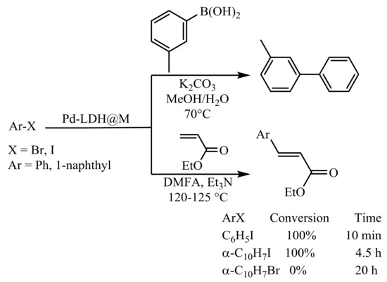 Suzuki‒Miyaura and Heck reaction of aryl halides catalyzed by Pd-LDH@M [22].