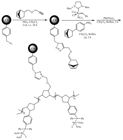 Coating the surfaces of magnetic NPs with polymers provides another way to stabilize metal NPs on the surfaces of magnetic materials. In addition, since a decrease in activity and selectivity often appeared due to the low solubility of the supported catalysts in the reaction media, by using various hydrophobic and hydrophilic polymeric coatings, the solubility of the catalyst in both organic and aqueous solvents is markedly enhanced. In this regard, Co-based magnetic NPs functionalized with a polymeric phosphine ligand were synthesized by Reiser and Hanson [23]. The grafting of this polymeric ligand onto carbon-coated cobalt magnetic NPs was based on a “click” reaction, followed by ring-opening metathesis polymerization (ROMP). Treating PPh3-functionalized Co/C magnetic NPs with Pd(OAc)2 results in the generation of a recyclable Pd catalyst (Scheme 5).