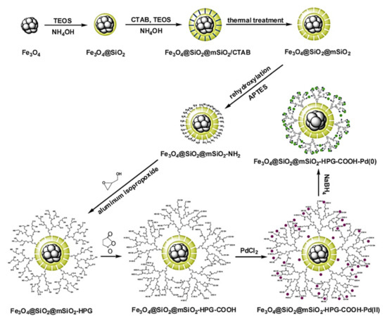 Preparation process of Fe3O4@SiO2@mSiO2-HPG-COOH-Pd(0). Reproduced with permission from [25].