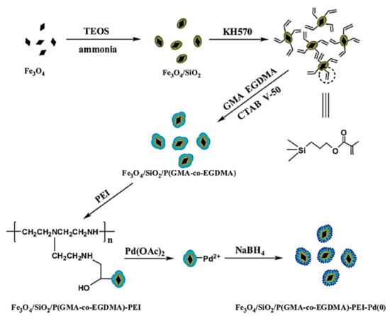 Preparation process of the Fe3O4/SiO2/P(GMA-co-EGDMA)-PEI-Pd(0) catalyst. Reproduced with permission from [26]. GMA: glycidyl methacrylate, EGDMA: ethyleneglycol dimethacrylate, CTAB: hexadecyltrimethylammonium bromide, V-50: 2,20-azobis-(2-methylpropionamide)dihydrochloride, PEI: polyethyleneimine.