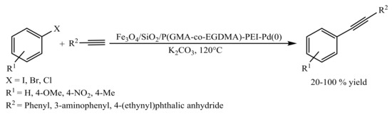 Sonogashira coupling reactions catalyzed by Fe3O4/SiO2/P(GMA-co-EGDMA)-PEI-Pd(0) [26].