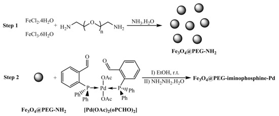 Preparation of Fe3O4@PEG-iminophosphine-supported nanopalladium catalyst [27].