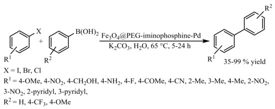Suzuki‒Miyaura reaction of aryl halides with arylboronic acids catalyzed by Fe3O4@PEG-iminophosphine‒Pd complex [27].