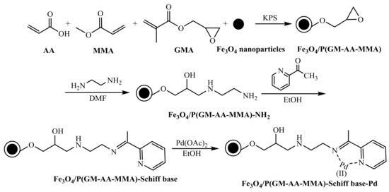 Synthesis of Fe3O4/P(GMA-AA-MMA)-Schiff base Pd [28].