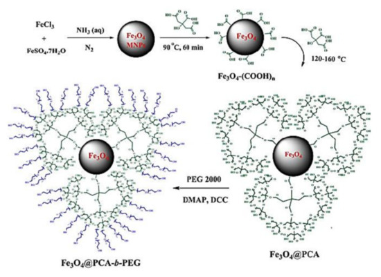 Synthetic route employed for preparation of Fe3O4@PCA-b-PEG magnetic NPs. Reproduced with permission from [29].