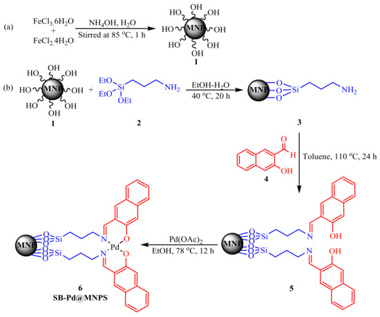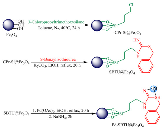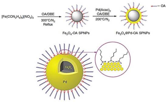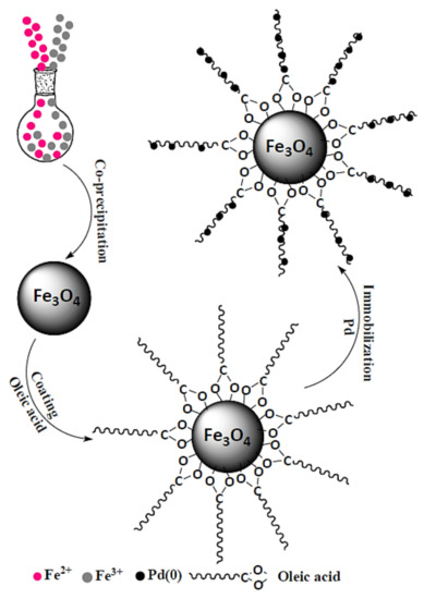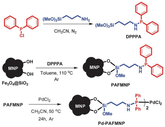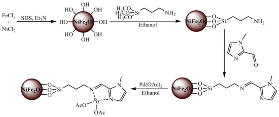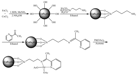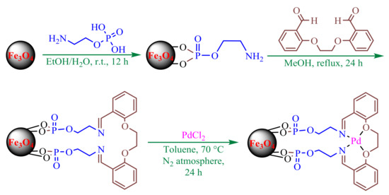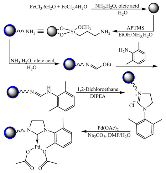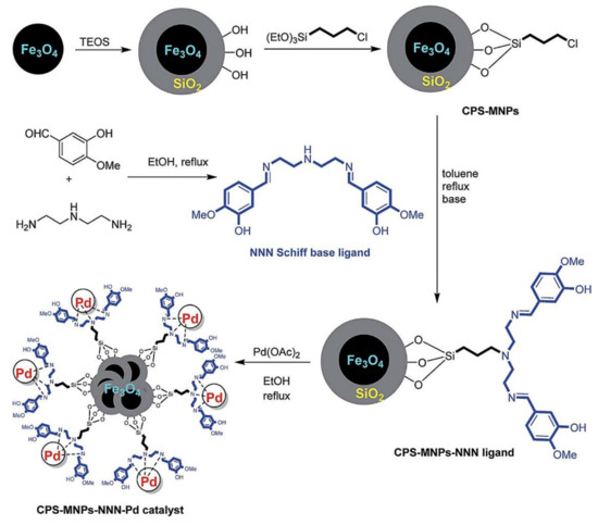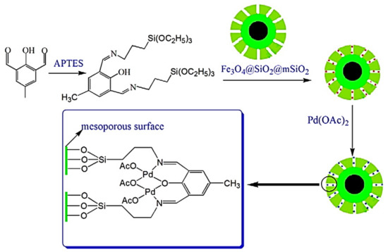 Preparation process of Schiff base complex of Pd(II) functionalized Fe3O4@SiO2 NPs. Reproduced with permission from [33].