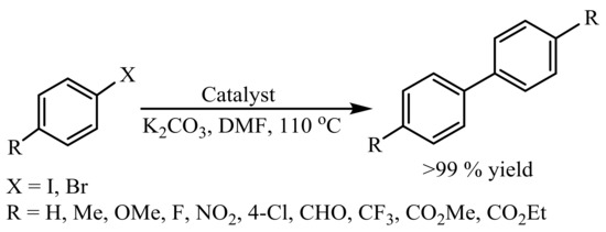 This catalyst with magnetic nanoparticle support acts as the reducing agent and catalyzes the reductive homocoupling of various aryl halides in the absence of additional reducing agents. A homocoupling reaction in DMF at 110 °C by using K2CO3 as the base demonstrated symmetrical biaryls in quantitative yields (Scheme 24). Furthermore, the catalyst can be recycled using a magnetic bar and reused in five consecutive runs. With the application of the catalyst for more than five runes, homocoupling yield was decreased, indicating the diminutive reducing capability of the MNPs. To confirm the possibility of the Fe3O4 magnetic core acting as a reducing agent, the XRD pattern of the recovered catalyst was analyzed. It indicated oxidation of Fe3O4 to Fe2O3 after five cycles and proved the synergetic role of Fe3O4 as a reducing agent in this process.
