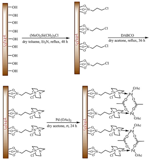 - Sobhani, S.; Pakdin-Parizi, Z. Palladium-DABCO complex supported on γ-Fe2O3 magnetic nanoparticles: A new catalyst for C‒C bond formation via Mizoroki-Heck cross-coupling reaction. Appl. Catal. A Gen. 2014, 479, 112–120. [Google Scholar] [CrossRef]