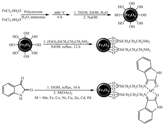 - Esmaeilpour, M.; Javidi, J.; Dodeji, F.N.; Abarghoui, M.M. M(II) Schiff base complexes (M = zinc, manganese, cadmium, cobalt, copper, nickel, iron, and palladium) supported on superparamagnetic Fe3O4@SiO2 nanoparticles: Synthesis, characterization and catalytic activity for Sonogashira-Hagihara coupling reactions. Transit. Met. Chem. 2014, 39, 797–809. [Google Scholar] [CrossRef]
