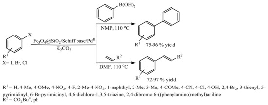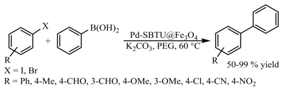The Suzuki‒Miyaura cross coupling reactions of aryl halides with arylboronic acids using the Fe3O4@SiO2@mSiO2-Pd(II) catalyst [66].
