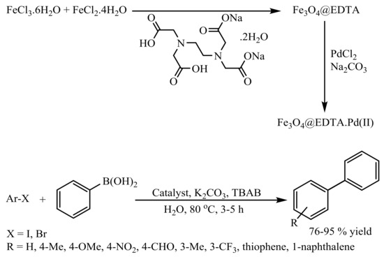 - Azizi, K.; Ghonchepour, E.; Karimi, M.; Heydari, A. Encapsulation of Pd(II) into superparamagnetic nanoparticles grafted with EDTA and their catalytic activity towards reduction of nitroarenes and Suzuki‒Miyaura coupling. Appl. Organomet. Chem. 2015, 29, 187–194. [Google Scholar] [CrossRef]