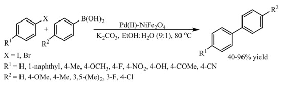 - Singh, A.S.; Shelkar, R.S.; Nagarkar, J.M. Palladium(II) on functionalized NiFe2O4: An efficient and recyclable phosphine-free heterogeneous catalyst for Suzuki coupling reaction. Catal. Lett. 2015, 145, 723–730. [Google Scholar] [CrossRef]