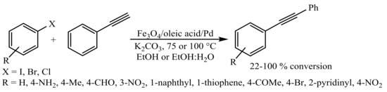 The Sonogashira reaction of aryl halides and phenylacetylene using the palladium complex catalyst immobilized on the superparamagnetic NPs [31].