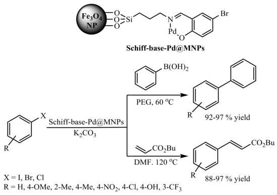 - Sobhani, S.; Falatooni, Z.M.; Asadi, S.; Honarmand, M. Palladium-Schiff base complex immobilized covalently on magnetic nanoparticles as an efficient and recyclable catalyst for Heck and Suzuki cross-coupling reactions. Catal. Lett. 2016, 146, 255–268. [Google Scholar] [CrossRef]
