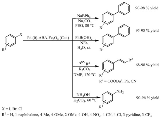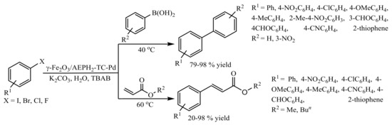 The heterogenized catalyst was used in the palladium-catalyzed Heck coupling reaction of aryl halides with olefin compounds in the presence of water as a green solvent and K2CO3 as base (Scheme 18). In addition, the catalyst could be simply separated from the reaction mixture by applying an external magnetic field and reused for more than 10 consecutive cycles without much loss in its activity.