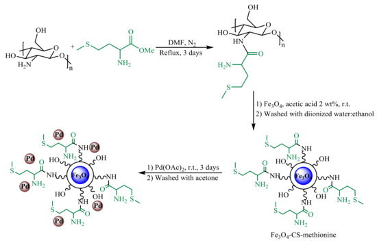 - Hajipour, A.R.; Tavangar-Rizi, Z. Methionine-functionalized chitosan-Pd(0) complex: A novel magnetically separable catalyst for Heck reaction of aryl iodides and aryl bromides at room temperature in water as only solvent. Appl. Organomet. Chem. 2017, 31, e3638. [Google Scholar] [CrossRef]