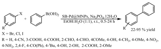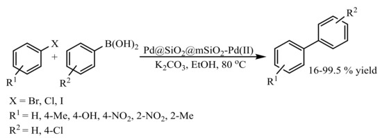 Suzuki‒Miyaura cross-coupling reaction between aryl halides and arylboronic acids with 0.5 mol % of obtained catalyst, in the presence of K2CO3 in EtOH at 80 °C, resulted in the preparation of biaryls products in excellent yields (Scheme 84). Fe3O4@SiO2@mSiO2-Pd(II) acted as an efficient and reusable catalyst that could provide high conversion even after six catalytic runs.