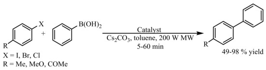 - Yin, L.; Liebscher, J. Carbon-carbon coupling reactions catalyzed by heterogeneous palladium catalysts. Chem. Rev. 2007, 107, 133–173. [Google Scholar] [CrossRef] [PubMed]