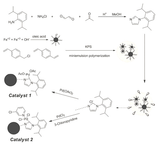 - Wilczewska, A.Z.; Misztalewska, I. Direct synthesis of imidazolinium salt on magnetic nanoparticles and its palladium complex application in the heck reaction. Organometallics 2014, 33, 5203–5208. [Google Scholar] [CrossRef]