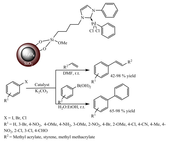 - Hajipour, A.R.; Tadayoni, N.S.; Khorsandi, Z. Magnetic iron oxide nanoparticles-N-heterocyclic carbene-palladium(II): A new, efficient and robust recyclable catalyst for Mizoroki-Heck and Suzuki‒Miyaura coupling reactions. Appl. Organomet. Chem. 2016, 30, 590–595. [Google Scholar] [CrossRef]