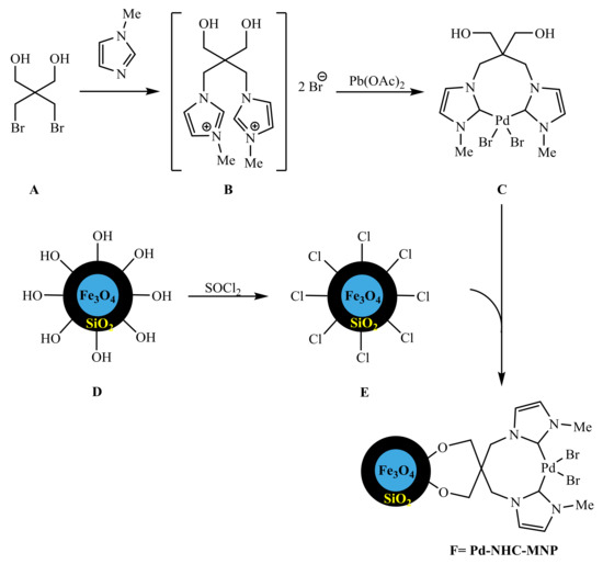 - Fareghi-Alamdari, R.; Saeedi, M.S.; Panahi, F. New bis(N-heterocyclic carbene) palladium complex immobilized on magnetic nanoparticles: as a magnetic reusable catalyst in Suzuki‒Miyaura cross coupling reaction. Appl. Organomet. Chem. 2017, 31, e3870. [Google Scholar] [CrossRef]