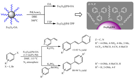 Heck and Suzuki‒Miyaura coupling reactions catalyzed by Fe3O4-Pd(OAc)2, Fe3O4-Pd0, and Fe3O4 Pd(PPh3)2(OAc)2 [21].