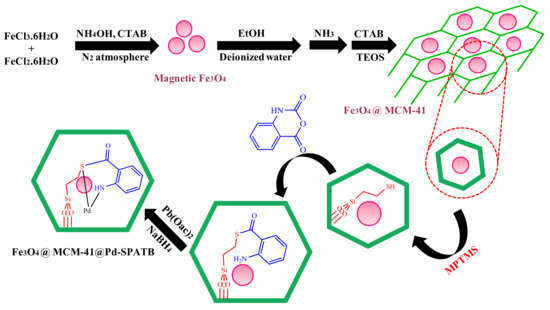 Synthesis of Fe3O4@MCM-41@Pd-SPATB. Reproduced with permission from [68].
