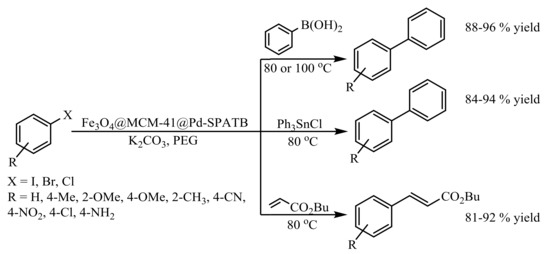 Catalytic activity of Fe3O4@MCM-41@Pd-SPATB in Suzuki‒Miyaura, Still, and Heck cross-coupling reactions [68].