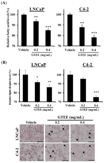 GTEE reduces the amounts of intracellular fatty acid and lipid accumulation in PCa cells. (A) LNCaP and C4-2 cells were treated with vehicle (0.3% ethanol) or GTEE (0.2 or 0.4 mg/mL) for 24 h. The levels of intracellular fatty acid were determined by a fatty acid quantification kit. The relative fatty acid level (%) was assigned as 100% in vehicle-treated PCa cells. Data were shown as the mean ± SD of three independent experiments. ** p < 0.01, *** p < 0.001. (B) GTEE decreased the amounts of lipid droplet accumulation assayed by the Oil Red O staining in LNCaP and C4-2 cells at 24 h. The relative lipid droplet level (%) was assigned as 100% in vehicle-treated cells. Data were shown as the mean ± SD of three independent experiments. * p < 0.05, ** p < 0.01, *** p < 0.001. The arrowheads indicate lipid droplets in PCa cells (bottom panel). Scale bars = 100 µm.