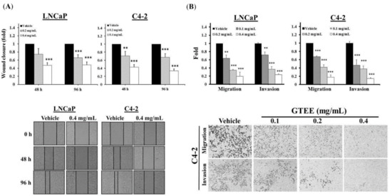 Next, the effects of GTEE on the migratory and invasive potentials of PCa cells were determined. A wound healing method was used to evaluate the migratory ability. As shown in Figure 4A, GTEE treatment led to a significant inhibition of wound closure in both LNCaP and C4-2 cells. Besides, the Boyden chamber method was also used to determine migration and invasion in PCa cells that were affected by GTEE. GTEE (0.1, 0.2 and 0.4 mg/mL) significantly decreased the capabilities of migration and invasion of LNCaP and C4-2 cells in a concentration-dependent pattern (Figure 4B and Figure S1). These biofunctional results suggest that GTEE suppressed cell growth and in vitro progression in LNCaP and C4-2 cells.