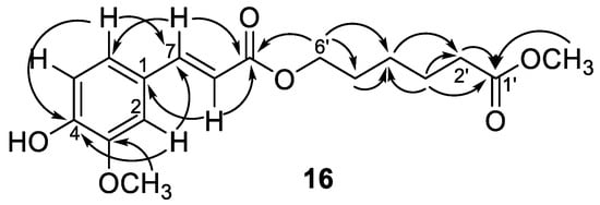 Compounds 16 and 17 showed the same adduct ion peaks and were both assigned the same molecular formula C17H22O6. The 1H-NMR spectrum of 16 revealed the existence of an aromatic protons at δH 7.07 (dd, J = 8.2, 1.8 Hz, H-6), 7.04 (d, J = 1.8 Hz, H-2), and 6.92 (d, J = 8.2 Hz, H-5); five methylenes at δH 4.19 (t, J = 6.6 Hz, H-6′), 2.34 (t, J = 7.4 Hz, H-2′), 1.67 (m, H-3′, 5′), and 1.47 (m, H-4′); and two methoxy singlets at δH 3.95 and 3.67. Additional signals at δH 7.59 (d, J = 16.0 Hz, H-7) and 6.47 (d, J = 16.0 Hz, H-8) suggested the presence of a trans double bond. The 13C-NMR spectrum revealed the existence of seventeen carbon atoms included an aromatic ring (δC 109.3, 112.7, 123.1, 127.0, 146.6, and 147.9), five methylenes (δC 64.0, 33.8, 28.1, 25.3, and 24.5), two methoxyls (δC 55.9 and 51.5), two carbonyls (δC 173.9 and 167.5), and a pair of olefinic carbons (δC 144.8 and 115.5). A 3,4-disubstituted cinnamoyl group linked with a hexanoyl alcohol was deduced from the NMR data which described above (Table 1). This was further confirmed by the key HMBC correlations from δH 3.67 (OCH3) to 173.9 (C-1′), from δH 4.19 (H-6′) to δC 167.5 (C-9), and 28.1 (C-5′), as shown in Figure 4. Therefore, compound 16 was confirmed as rhodiolate by comparison of its spectral data with those reported [24]. Compound 17 displayed closely related 1D NMR spectroscopic and mass spectrometric characteristics to 16 and was determined to have a similar structure to 16. However, a pair of olefinic protons at δH 6.80 (d, J = 12.9 Hz, H-7) and 5.81 (d, J = 12.9 Hz, H-8) suggested the cis double bond feature. However, 2D NMR spectral analysis of 17 could not be furnished because of the rapid transformation of cis–trans double bond. Thus, the structure of compound 17 was concluded to be methyl 6-((Z)-3-(4-hydroxy-3-methoxyphenyl)acryloyloxy)-hexanoate and assigned the trivial name as tinosporin B.