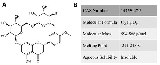 Didymin (systematic name (S)-7-((6-O-(6-Deoxy-alpha-l-mannopyranosyl)-β-d-gluco-pyranosyl)oxy)-2,3-dihydro-5-hydroxy-2-(4-methoxyphenyl)-4H-benzopyran-4-one), is a typical dietary glycoside also known as neoponcirin and isosakuranetin-7-O-rutinoside (Figure 1). Didymin is commonly found in citrus fruits and campanula, including mandarin, bergamot, orange, Origanum, and Vulgare Duanxueliu. Due to its high content in citrus and easy extraction, didymin has been recognized as an inexpensive, safe and effective oral drug that does not cause toxicity to normal tissues []. The therapeutic potential of didymin with anti-oxidant in promoting health is drawing more attention in recent five years. With the intensive pharmacological study results, didymin seems to have more important prospects other than a pure natural antioxidant. For example, Hung et al. demonstrated the anticancer effect of didymin and provided evidence that didymin can cause cell death in non-small cell lung cancer cells [].
