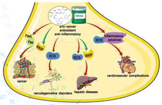 Many plants, fruits, and their products are known to have health benefits for human and have been used for the prevention and treatment of many diseases since ancient times. Citrus plants, e.g., oranges, grapes, mandarins, limes, and lemons, are rich in various flavonoids, which possessing various biological activities as is well known. In recent years, studies have confirmed that didymin as a flavonoid showed extensive inhibition of oxidative stress and affected cell proliferation and invasion pathways to anticancer. Also, Morelli et al. first discovered that didymin could protect nerve cells from oxidative damage []. Moreover, flavonoids may have therapeutically potential in the treatment of inflammation-related diseases as cytokine modulators []. Similarly, didymin is also reported to be involved in modulating the immune system as an anti-cancer agent in cancer treatment. Many molecular mechanisms have been proposed and elucidated to confirm the potential activities of didymin. In this regard, more studies have focused on didymin and its multiple therapeutic targets, but in vivo data is scarce. Only limited studies with detailed pharmacokinetic studies and in vivo activities of didymin have been performed. Most research is limited to in vitro studies on cellular physiology and lack sufficient information on the in vivo data and practical formulation strategies. In this part, we will discuss recent advances in understanding the therapeutic effects of didymin. We have summarized the potential application of didymin for various diseases (Figure 2), including cancer, neurodegenerative diseases, cardiovascular complications, and its underlying molecular mechanisms with various signaling modulations (Table 2), which could enlighten future development of this potential dietary medicine.