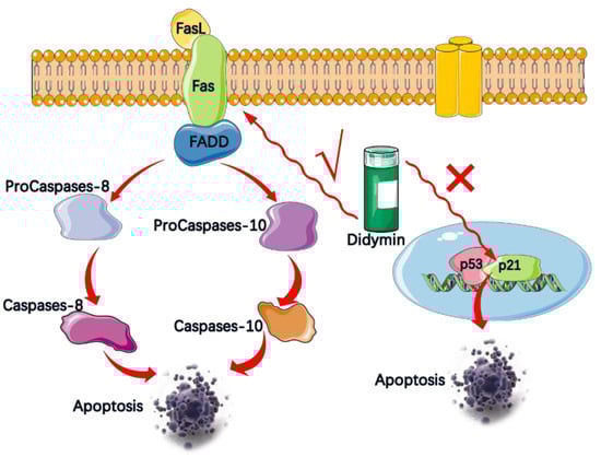 Epidemiological studies have indicated that high levels of flavonoids, fruit and vegetable intake might reduce the prevalence of cancer in humans. Hung et al. first investigated the potential anti-cancer properties of the dietary flavonoid glycoside didymin in human NSCLC cancer cells in vitro and in vivo []. Didymin showed a significant antiproliferative effect in lung cancer cells in a dose-dependent manner. The half maximal inhibitory concentration (IC50) values of didymin were 12.57 μM and 11.06 μM in A549 and H460 cancer cells []. To clarify the underlying antitumor properties of didymin, mechanism of action studies, including apoptosis, cellular cycle distribution, and cellular signaling were carefully carried out (Figure 3). Many flavonoids induce apoptosis in cancer cells by mediating p53 and p21/WAF1 [,]. However, Hung’s group confirmed that the primary pathway of apoptosis in lung cancer cells induced by didymin is the Fas/Fas ligand apoptosis system. The Fas/FasL system has been recognized as a key signal transduction pathway of cellular apoptosis []. To be more specific, Fas is a cell surface and its ligand (FasL) could recognize and activate Fas, which leads to oligomerization of the intracellular death domain and recruitment of the intracellular adaptor Fas-associated death domain (FADD). After binding, FADD can activate procaspase-8 and procaspase-10 in the death-inducing signaling complex, causing A549 and H460 cells apoptosis or death without the mediation of p53 and p21/WAF1 (Figure 3). More importantly, in vivo study showed that 6 mg/kg/day of didymin significantly suppress tumor growth without detectable side effects in tumor-bearing mice []. Harvested A549 tumor xenografts at the end of in vivo study revealed that increased didymin-mediated apoptosis correlated with the results of the in vivo anti-tumor study, therefore, didymin is involved in the Fas/FasL apoptotic system in the anti-proliferative effects of cancer cells, resulting in increased apoptosis and apparent anti-tumor property. However, whether this pro-apoptotic effect contributes to the potential chemotherapy effect in fighting NSCLC still requires future clinical research in human patients.
