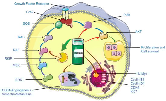 Didymin affects neuroblastoma signaling pathways. Stimulating the expression of RKIP is a key role for didymin to exert its efficacy. Also, didymin inhibits N-Myc transcription, on the other hand, didymin decreases the expression levels of PI3K, Akt, vimentin, and down-regulates cyclin D1, B1, and CDK4. By staining the pathological sections of the tumor tissue, didymin not only reduced the expression of the angiogenesis marker CD31 in vivo but also inhibited the expression of the proliferation markers Ki67 and N-Myc. The blue arrow indicates normal signal transduction, the green arrow indicates enhancement, and the red arrow represents inhibition.