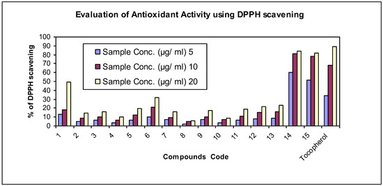 Figure 2 displays DPPH radical scavenging ability of Tocopherol and all synthesized compounds 1–15 at different concentrations; compounds 14 and 15 showed excellent anti-oxidant activity at all concentrations due to the introduced 5-oxo-3-Phenyl/Methyl-dihydropyrazole ring. Furthermore, it is apparent that compound 1 which has hydrazide group at the periphery of the molecular chain, has moderate anti-oxidant activity at all concentrations; derivatives 2–7, 9, 11–13 possessed weak anti-oxidant activity at all concentrations while derivatives 8 and 10 showed very weak anti-oxidant activity at all concentrations. All of these results agree with the IC50 values shown in Table 3.