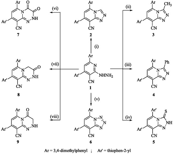 In the course of our investigation, we have found that 6-(3,4-dimethylphenyl)-2-hydrazinyl-4-(thiophen-2-yl)-pyridine-3-carbonitrile [62] is an excellent building block for the synthesis of a numerous heterocyclic ring systems. Thus, 2-hydrazino-nicotinonitrile 1 reacted with formic acid or acetic acid/acetic anhydride or benzoyl chloride and/or carbon disulfide and afforded the corresponding triazolopyridine derivatives 2–5 (Scheme 1). The infrared (IR) spectra of new triazolopyridine derivatives 2–5 showed an absorption band characteristic for (CN) at 2213, 2211, 2209 and 2212 cm−1, respectively. In addition to the disappearance of the characteristic band for NH, NH2 groups of starting 2-hydrazino-nicotinonitrile 1. The 1H nuclear magnetic resonance (NMR) spectrum of compound 2 showed signals at δ = 2.26, 2.28 for two CH3 group, 7.23–7.34 & 7.51–7.64 for aromatic–H, 7.92 for pyridine–H and 8.11 for triazole–H. The 1H-NMR spectrum of compound 5 showed signals at δ = 2.26, 2.27 for two CH3 group, 7.23–7.31 & 7.50–7.62 for aromatic–H, 7.89 for pyridine–H and 8.87 for the NH group, and its mass spectrum showed the molecular ion peak at m/z (%): 362 (M+, 45%) while its base peak was m/z 304 (M+–NCS, 100%) (cf. the Materials and Methods Section).
