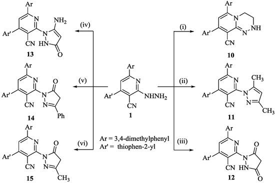 Further transformation of compound 1 with a different active methylene group, namely acetyl acetone, diethylmalonate, ethyl cyanoacetate, ethyl benzoylacetate and/or ethyl acetoacetate, produced the pyridine–pyrazole hybrid derivatives 11–15 (Scheme 2). The 1H-NMR spectrum of compound 11 displays signals at δ = 2.30, 2.67 for two new CH3 groups, 5.96 for pyrazole–H in addition to two CH3 group, Aromatic–H and pyridine–H (cf. the Materials and Methods Section). The IR spectrum of compound 12 revealed absorption bands attributed to (NH); (CN) and two (C=O) groups at 3220; 2215; 1729 and 1680 cm−1, respectively, and its 1H-NMR spectrum showed the signals of CH2 and NH protons for the pyrazole ring at δ = 5.13 and 9.08, respectively, in addition to two CH3 group, Aromatic–H and pyridine–H (cf. the Materials and Methods Section). The IR spectrum of compound 13 showed bands at 3233; 3117; 2210 and 1685 cm−1 for (NH2); (NH); (CN) and (C=O) groups, respectively, and its 1H-NMR spectrum showed the signals of CH; NH and NH2 protons for the pyrazole ring at δ = 6.12; 7.89 and 9.13, respectively, in addition to two CH3 group, Aromatic–H and pyridine–H (cf. the Materials and Methods Section). The IR spectra of both 14 and 15 showed bands for (CN) and (C=O) groups at 2217; 1665 and 2215; 1778, respectively. The 1H-NMR spectrum showed the signals of CH2 for the pyrazole ring at δ = 2.93; 3.10 and 3.71; 3.96, respectively (cf. the Materials and Methods Section).