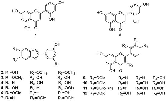 Structures of compounds 1–12 from M. alba leaves.