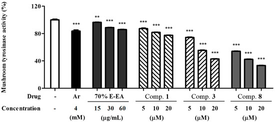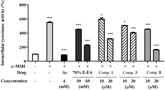 In addition, the ethyl acetate fraction of the initial ethanol extract (70% E-EA) and the three single compounds isolated from it were evaluated for their inhibitory effects against intracellular tyrosinase activity in α-MSH-induced B16-F10 melanoma cells. Compounds 3 and 8 significantly inhibited intracellular tyrosinase activity in a dose-dependent manner in α-MSH-stimulated B16-F10 cells (see Figure 4).