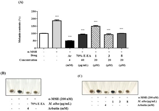 Effects on melanogenesis in murine B16-F10 cells; B16-F10 cells were pretreated with test samples for 2 h and then incubated with alpha-melanocyte-stimulating-hormone (α-MSH) (200 nM) for 72 h. The cell pellets were dissolved in 1N NaOH with 10% DMSO. The cell lysates were transferred to 96-well plates and the absorbances at 405 nm were detected using an ELISA microplate reader. (A) 70% E-EA, 1, 3, and 8 decreased the α-MSH-induced production of melanin. *** p < 0.001 compared with the α-MSH-treated group; (B,C) indicate the colors of the pellets from α-MSH-induced B16-F10 melanoma cells.