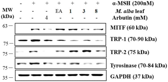 B16-F10 cells were cultured at a density of 1.5 × 105 cells/well in 6-well plates and pretreated with 70% E-EA (60 µg/mL), three compounds (20 µM), or arbutin (4 mM) for 2 h, followed by treatment with α-MSH (200 nM) for 24 h. The cells were washed twice with cold PBS and lysed in a lysis buffer with PIC for 30 min on ice. The cell lysates were centrifuged at 12,000 RPM for 10 min at 4 °C. The protein concentration of lysates was measured by Bradford assay (Bio-Rad, Hercules, CA, USA). The lysates (20 µg) were resolved by 12% sodium dodecyl sulfate-polyacrylamide gel electrophoresis (SDS-PAGE) and transferred to polyvinylidene difluoride (PVDF) membranes (Millipore, Bedford, MA, USA) at 100 V for 2 h. The PVDF membranes were incubated in a blocking buffer (5% skim milk and 0.05% Tween 20 in PBS) for 2 h. The membranes were incubated with primary antibodies against MITF (Santa Cruz Biotechnology, Santa Cruz, CA, USA), tyrosinase (Santa Cruz Biotechnology, Santa Cruz, CA, USA), TRP-1 (Santa Cruz Biotechnology, Santa Cruz, CA, USA), TRP-2 (Santa Cruz Biotechnology, Santa Cruz, CA, USA), p-38 (Santa Cruz Biotechnology, Santa Cruz, CA, USA), pp-38 (Santa Cruz Biotechnology, Santa Cruz, CA, USA), p-CREB (Cell Signaling Technology, Danvers, MA, USA), CREB (Cell Signaling Technology, Danvers, MA, USA), or GAPDH (Santa Cruz Biotechnology, Santa Cruz, CA, USA) at 4 °C overnight. After being washed, the membranes were incubated with horseradish peroxidase-conjugated anti-rabbit or anti-mouse immunoglobulin secondary antibodies for 1 h 30 min. The protein band detections on the PVDF membranes were conducted by using WesternBright™ ECL reagents (Advansta Corp., Menlo Park, CA, USA) and a C300 chemiluminescence imager (Azure Biosystems, Inc., Dublin, CA, USA).